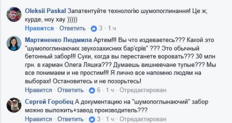 "Артем!!! Вы что издеваетесь??? Какой это "шумопоглинаючих звукозахисних бар'єрів" ??? Это обычный бетонный забор!!! Суки, когда вы перестанете воровать??? 30 млн грн. в карман Олега Ляшка??? Думаешь вишневчане тупые??? Мы все понимаем и не простим!!! Я лично все напомню людям на выборах! Остановитесь и не позорьтесь!" - написала громадський активіст, волонтер Людмила Мартиненко.