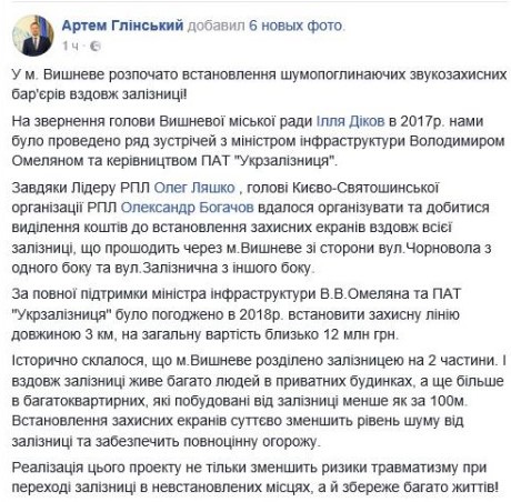 "У м. Вишневе розпочато встановлення шумопоглинаючих звукозахисних бар'єрів вздовж залізниці! На звернення голови Вишневої міської ради Ілля Діков в 2017р. нами було проведено ряд зустрічей з міністром інфраструктури Володимиром Омеляном та керівництвом ПАТ "Укрзалізниця".
